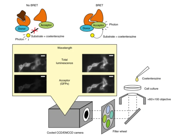 原理:一种流行的基于邻近的检测方法,即将一种目标蛋白与生物发光能量供体融合,其他蛋白质与荧光能量受体融合,可监测活体内的蛋白质-蛋白质相互作用和构象重排细胞。