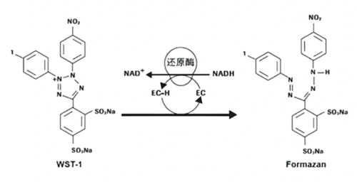 原理概要:基于细胞内琥珀酸脱氢酶活性,将无色的底物转化为有色产物,例如将四氮唑盐(如MTT、XTT、WST-1、WST-8等)还原为有色的甲瓒(Formazan),通过测定产物的量来评估细胞的活性和增殖能力。
